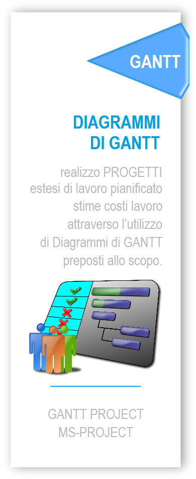 Detengo buone capacità nella realizzazione di PROGETTI estesi di lavoro pianificato, stime costi lavoro, attraverso la fruizione di MS-PROJECT preposto allo scopo.