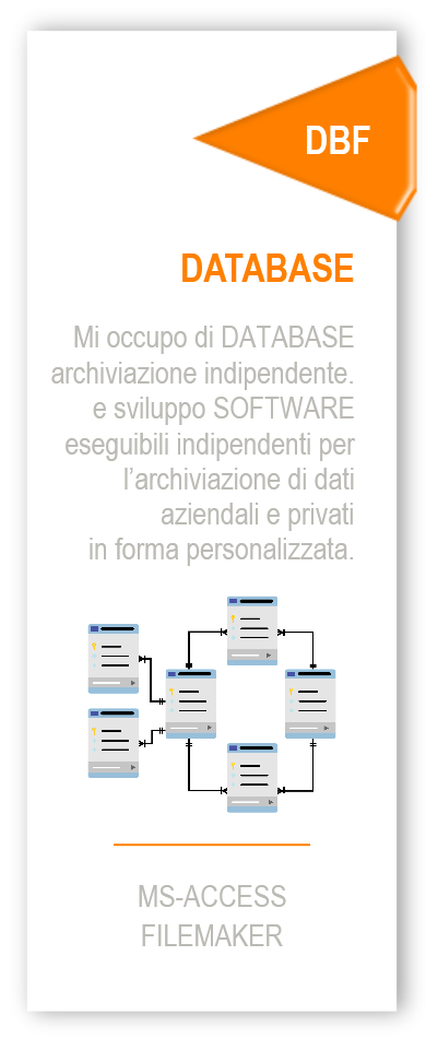 In questi anni ho lavorato con linguaggi di PROGRAMMAZIONE, privilegiando l'ambito che concerne i DATABASE e quindi l'archiviazione indipendente. In tal senso ho maturato la capacità di SVILUPPARE tipi di SOFTWARE eseguibili indipendenti per l'archiviazione di dati aziendali e privati in forma personalizzata.